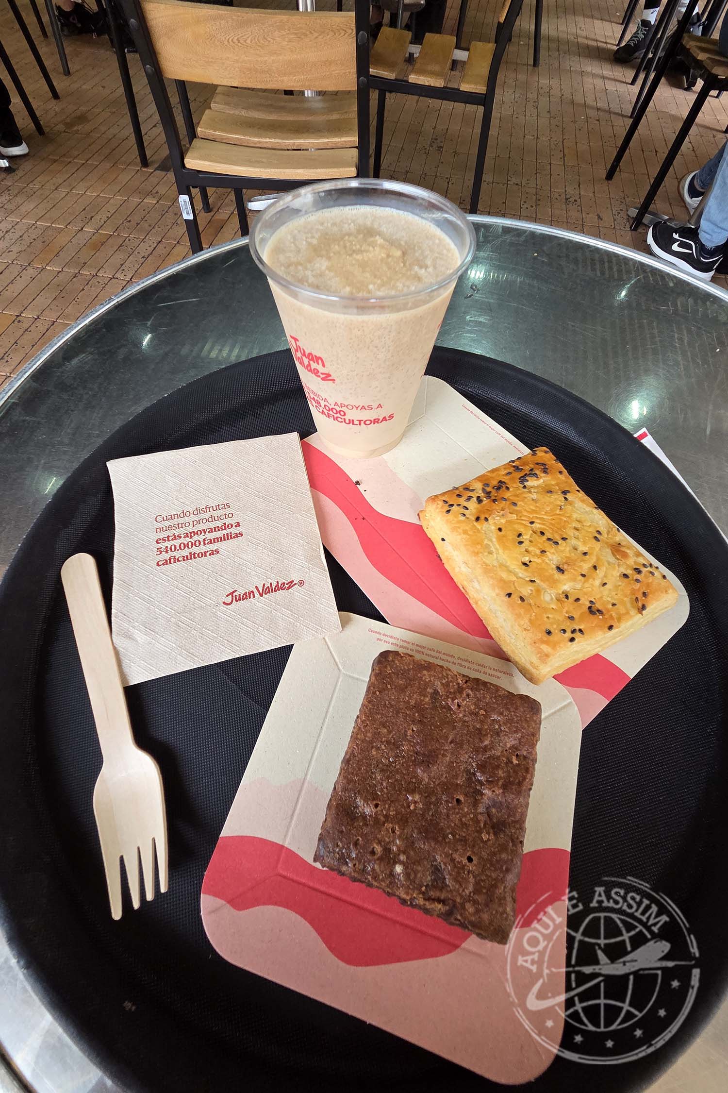 Por volta das 15h, parei em um Juan Valdez Café, onde comi um pastel delicioso e um brownie maravilhoso. Pedi um café gelado e acabei recebendo uma bebida alcoólica — provavelmente não entendi direito o espanhol da atendente, que aqui é mais rápido e menos “limpo” do que o do Chile. Bebi um gole, não gostei e deixei o copo cheio na mesa. Faz parte.