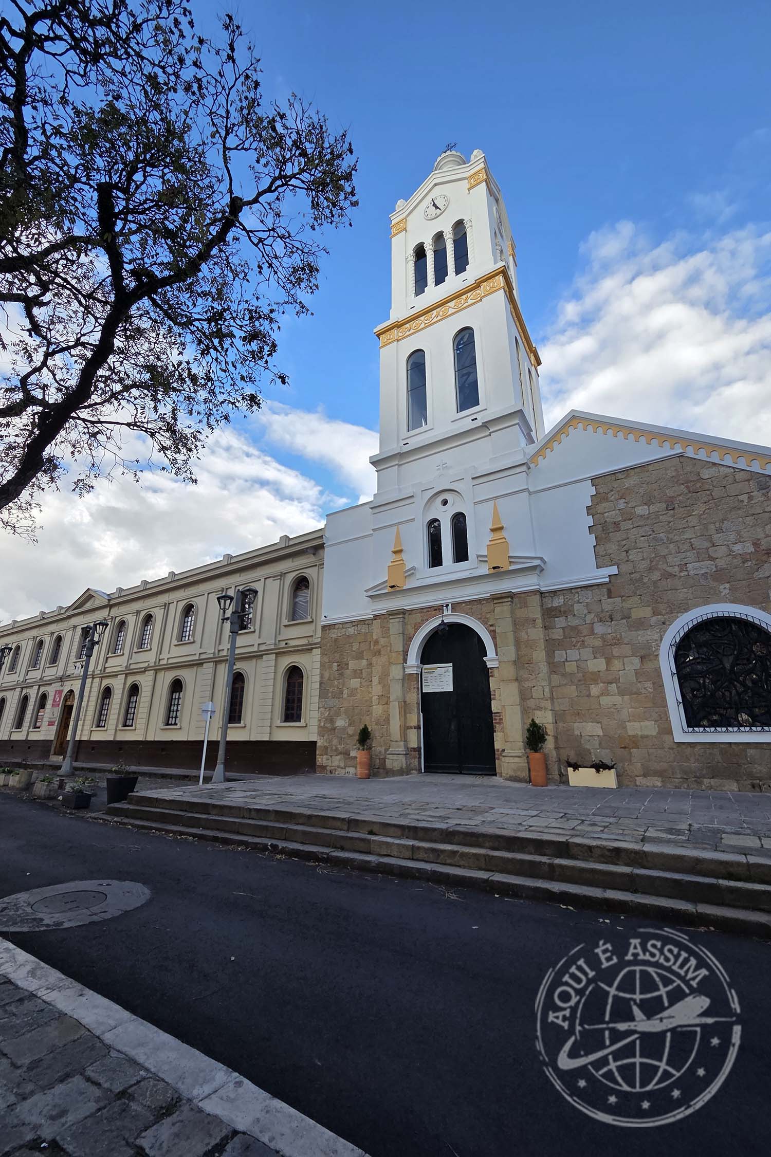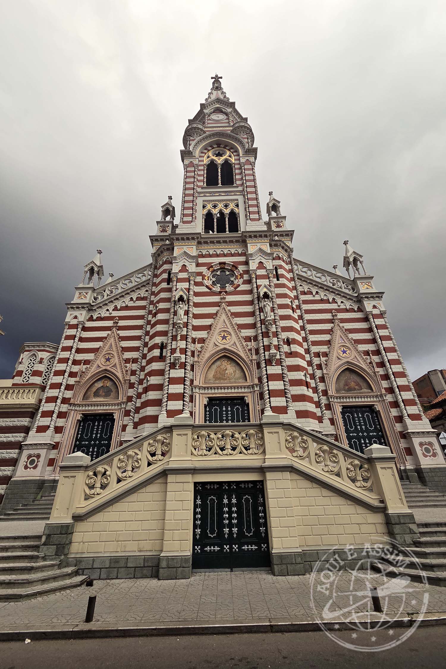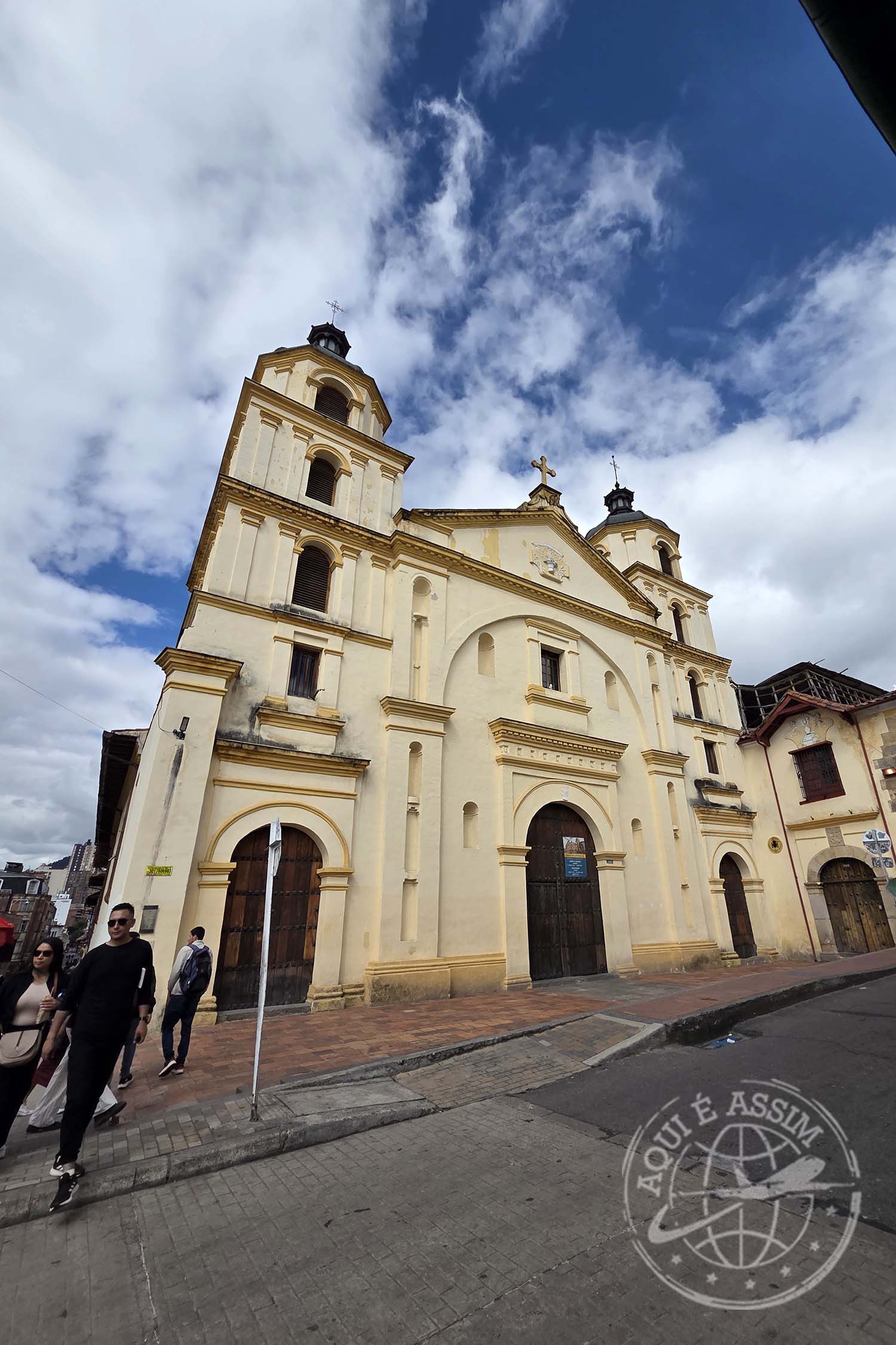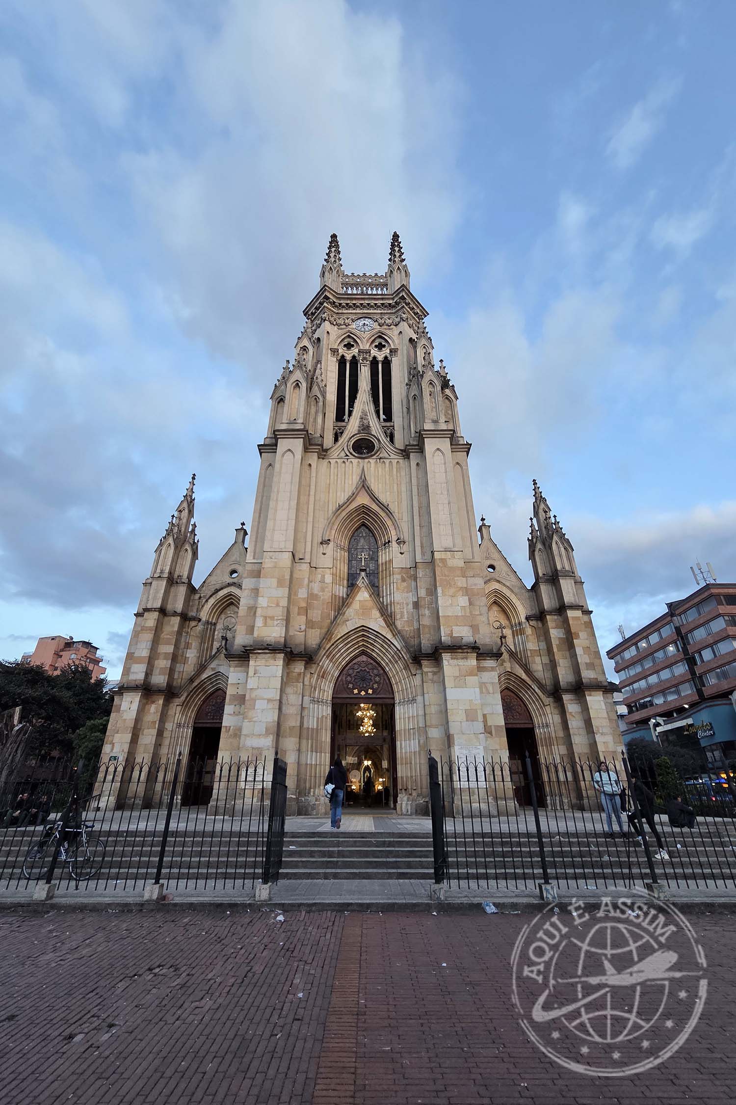 Ao sair, caminhei cerca de 400 metros até a Iglesia del Carmen, uma das mais impressionantes de Bogotá. De longe, ela parece um doce gigante — toda branca e vermelha, com listras que lembram pirulito de natal. Fiquei admirando por fora, porque estava fechada. Dizem que o interior é ainda mais bonito, mas só a fachada já basta pra encantar.
