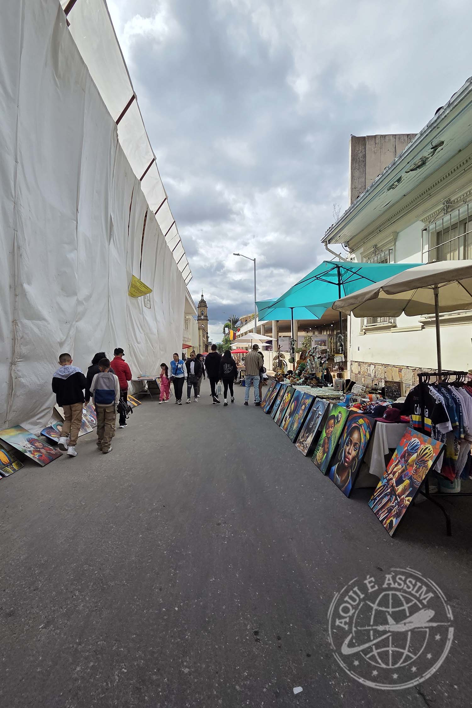 Mesmo sendo um dia de semana, havia vida por ali — pequenas barracas abertas, artesãos vendendo lembranças e o som suave das músicas colombianas que sempre parecem sair de algum canto.