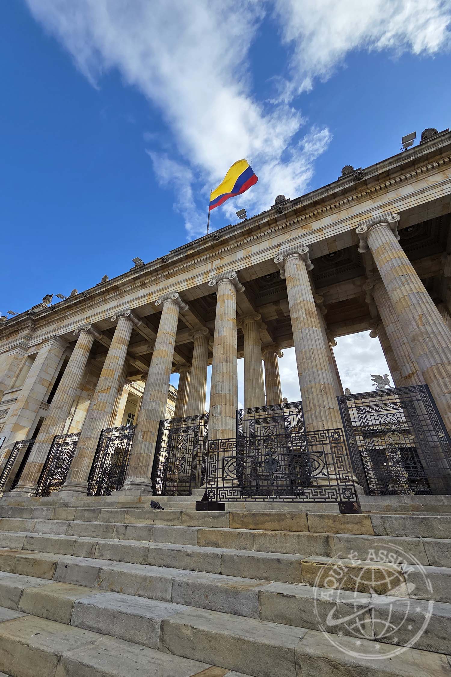 Segui caminhando até a Plaza Bolívar, passando pelas colunas gregas do Capitólio e o Palácio da Justiça. Achei que encontraria a praça vazia, mas me enganei: ainda havia bastante movimento. Fiz mais algumas fotos, observei o vai e vem das pessoas e segui rumo à minha parada final: La Puerta Falsa.