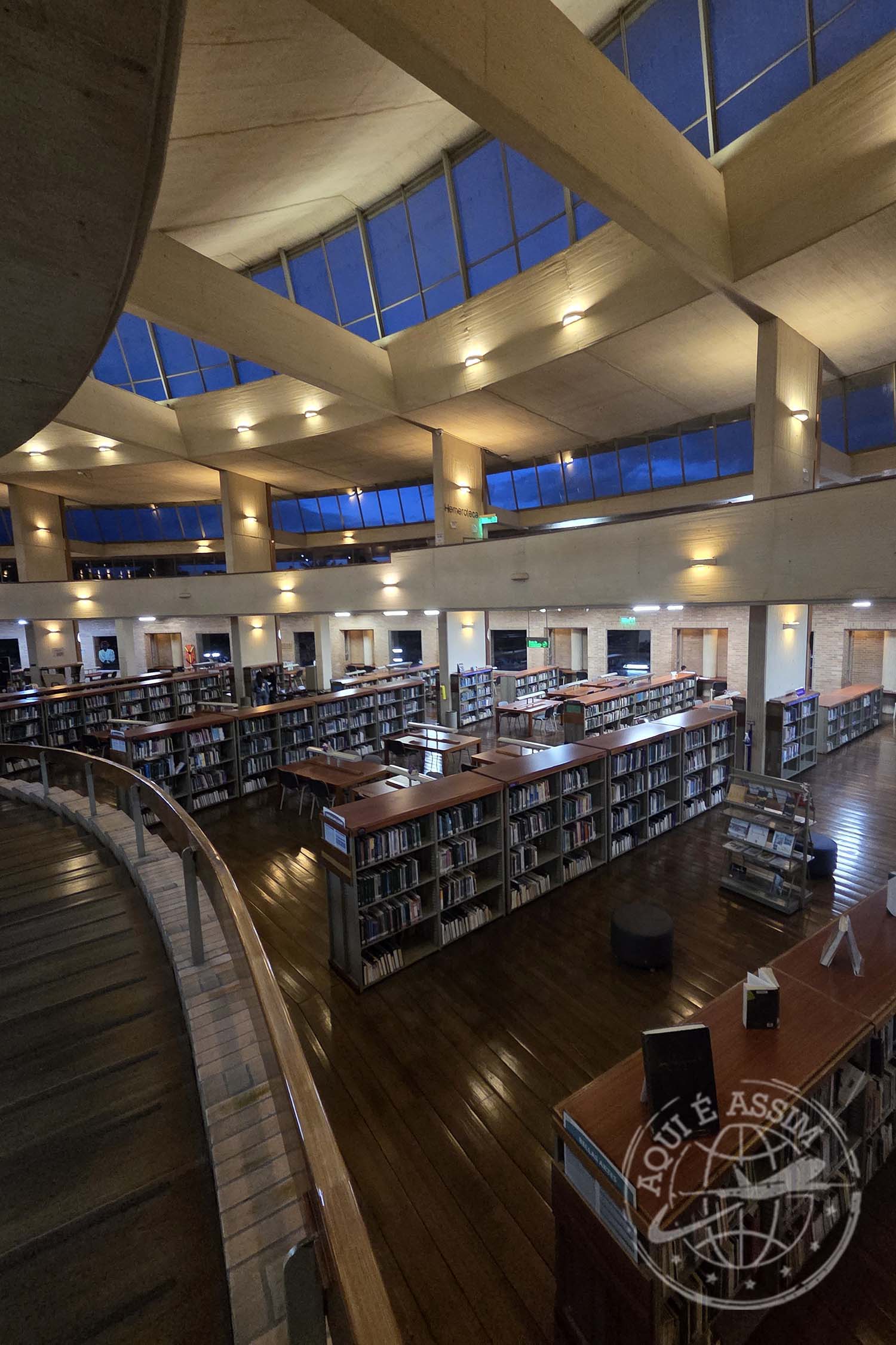 Atravessei a passarela até a Biblioteca Pública Virgilio Barco, que fica ao lado do parque. A arquitetura circular é belíssima, com grandes janelas e uma vista panorâmica para o verde. Entrei por alguns minutos, olhei o saguão e os corredores, mas o café já estava fechado. Era 18h12 quando comecei a voltar pra casa.