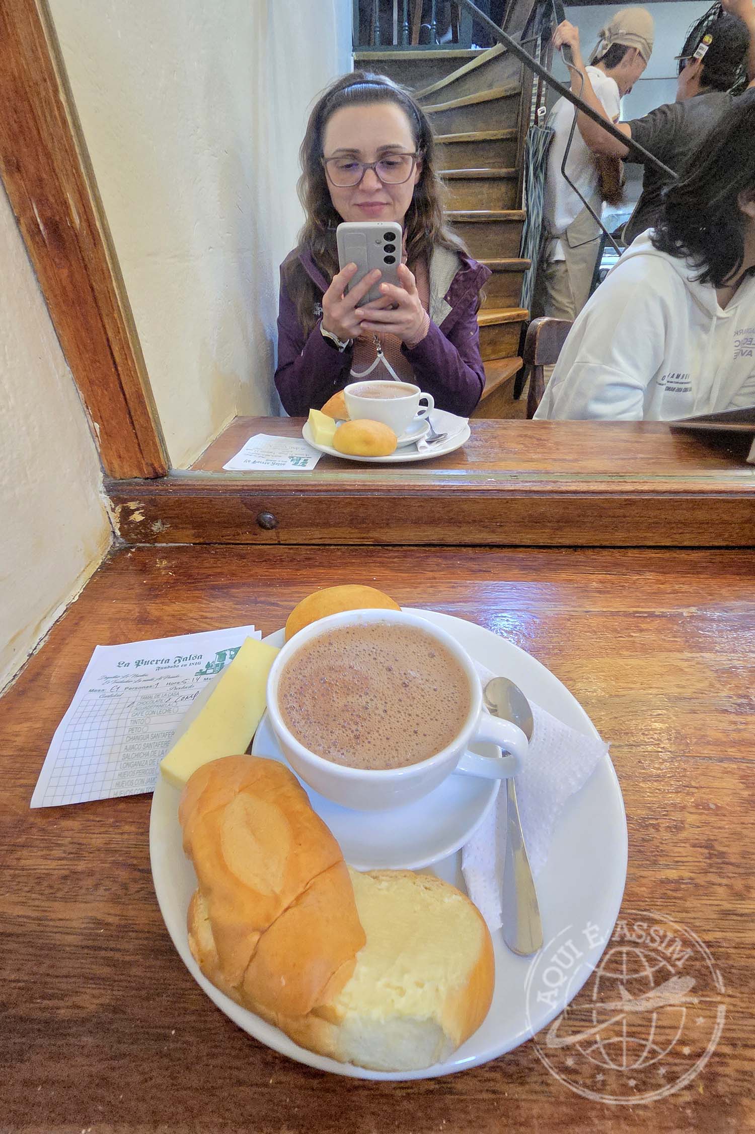 Chegando lá, perguntei se havia ajiaco (a famosa sopa colombiana), mas já tinha acabado. A Dona sugeriu o tamale, servido na folha de bananeira — mas eu não estava com tanta fome. Então, ela sorriu e recomendou o clássico da casa: chocolate quente com queijo e pão.