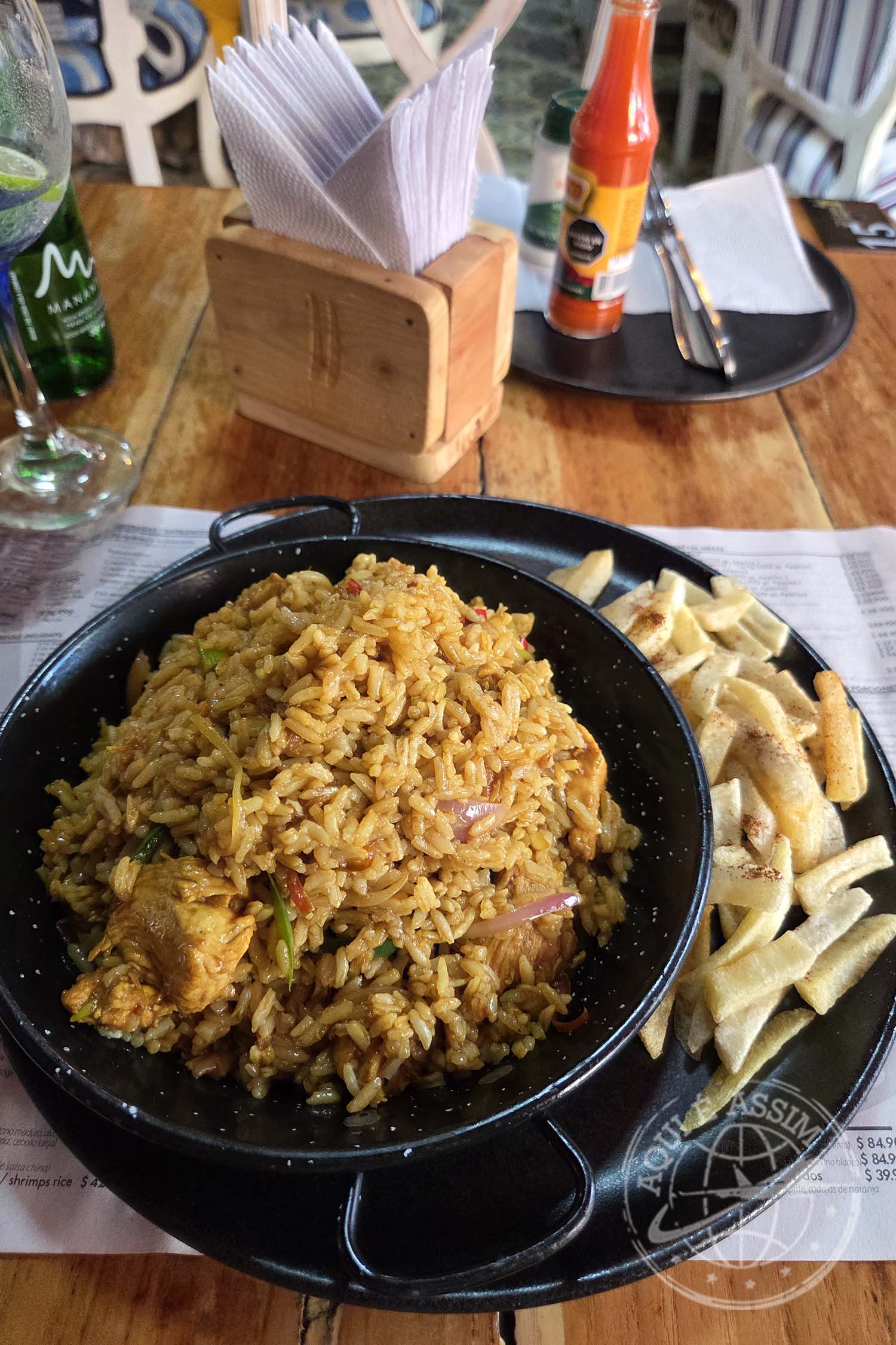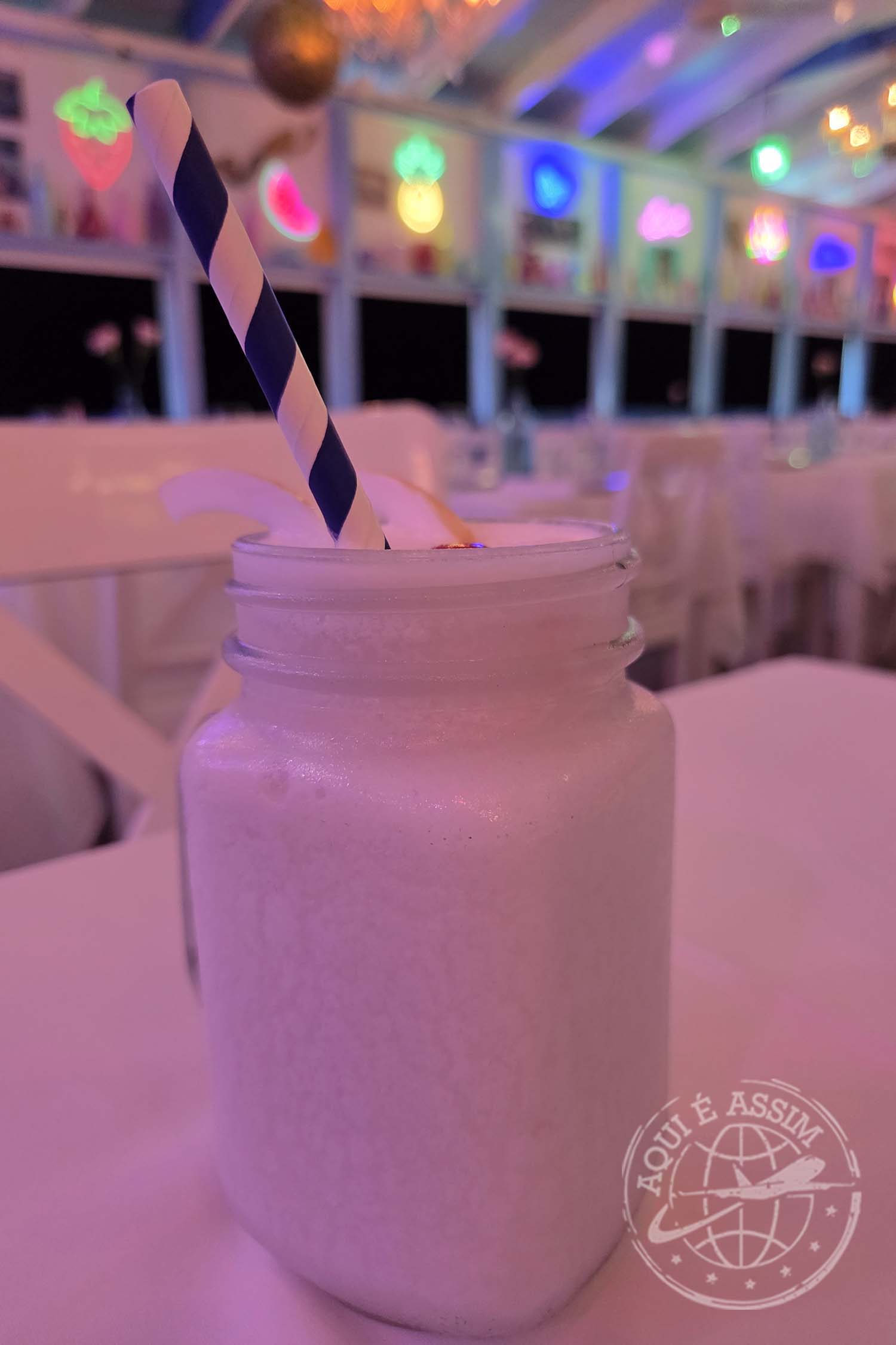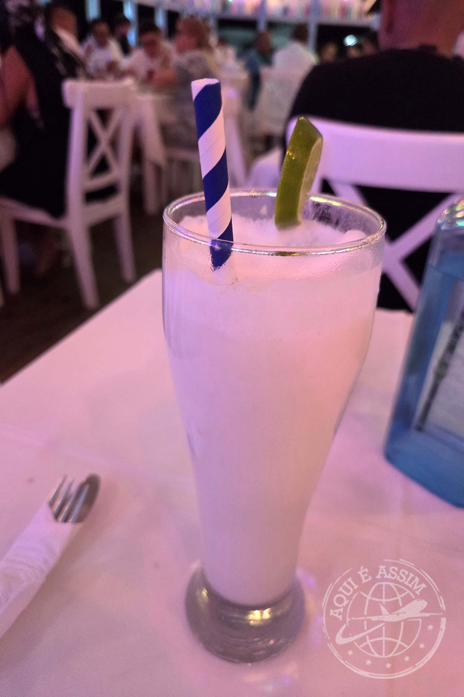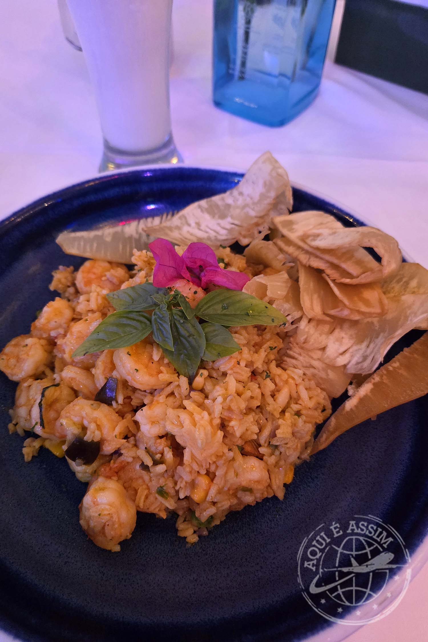 O ambiente é lindo, romântico, todo cercado pelo mar, com uma vista espetacular e música suave de fundo. Pedi um Coco Loco, uma entrada fria de atum — que estava fabulosa, delicada, fresca, perfeitamente temperada —, um arroz com camarão como prato principal e uma limonada de coco pra fechar a noite.