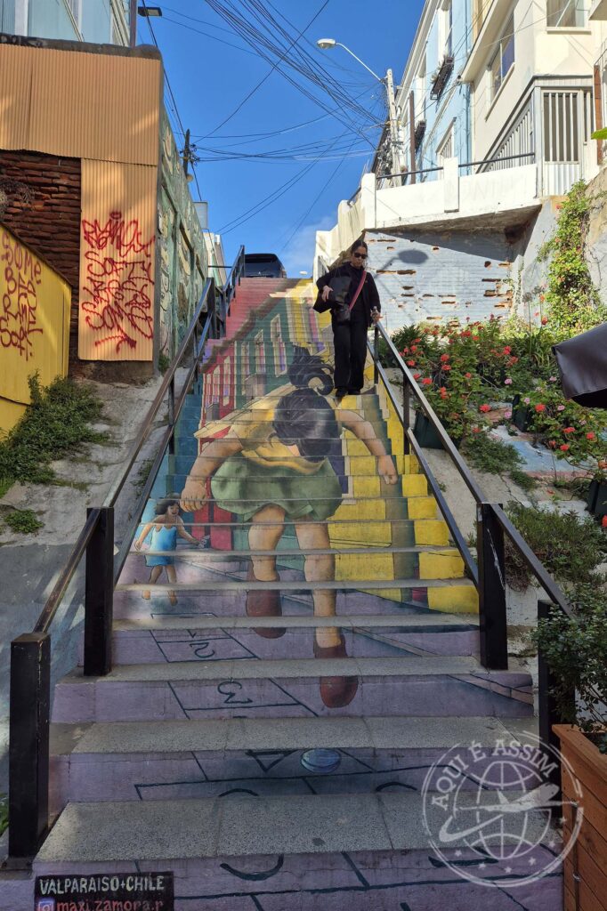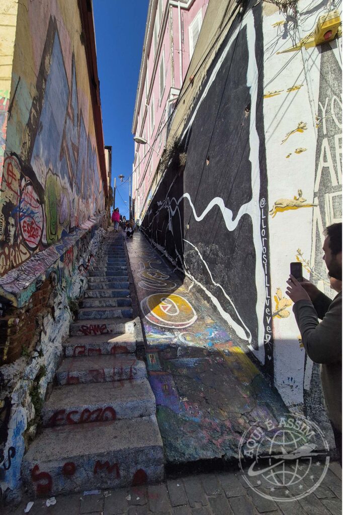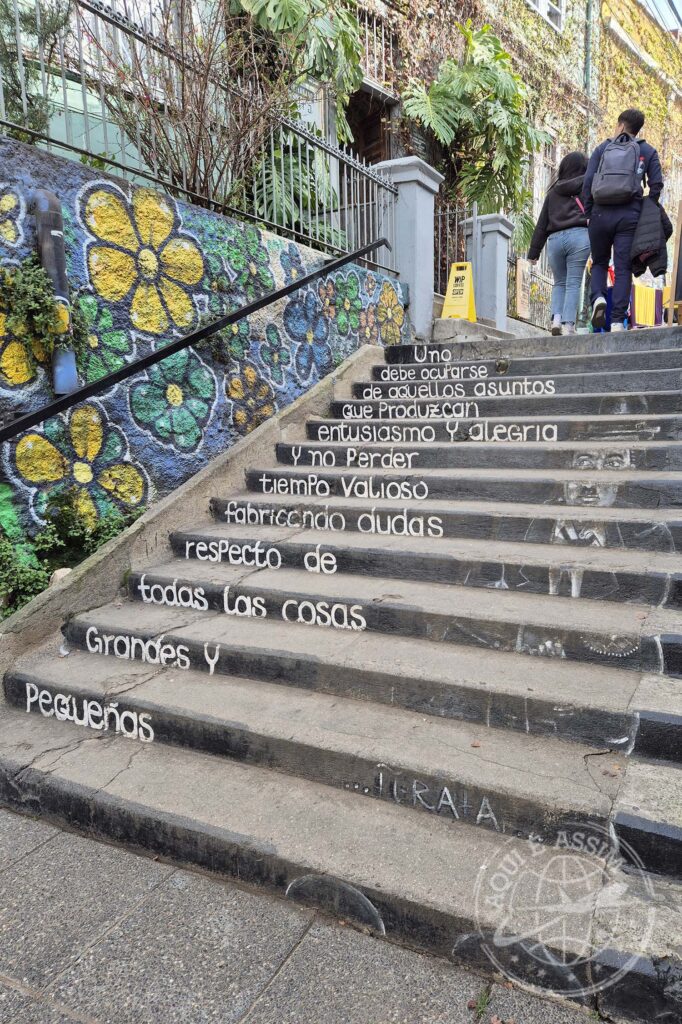 De Viña seguimos para Valparaíso, cidade vizinha, artística e boêmia, considerada Patrimônio Mundial da UNESCO. Caminhamos pelo centro histórico, subimos de funicular até os morros cheios de casinhas coloridas, ouvimos histórias de artistas locais e apreciamos a vista da baía.