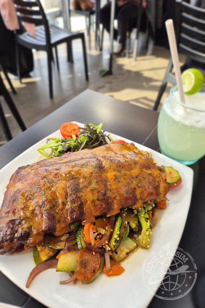 Almoçamos em um restaurante local. Pedi costela de cerdo com legumes, prato típico e muito saboroso.